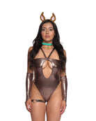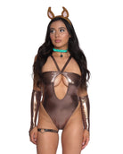 The Scooby Boo Bodysuit 5 Piece Set is all about attitude, featuring a bold chest cutout in sleek, shiny brown fabric. Complete the look with arm sleeves, a leg garter, sharp Scooby ears, and a statement collar—perfect for taking your festival or Halloween look to the next level.