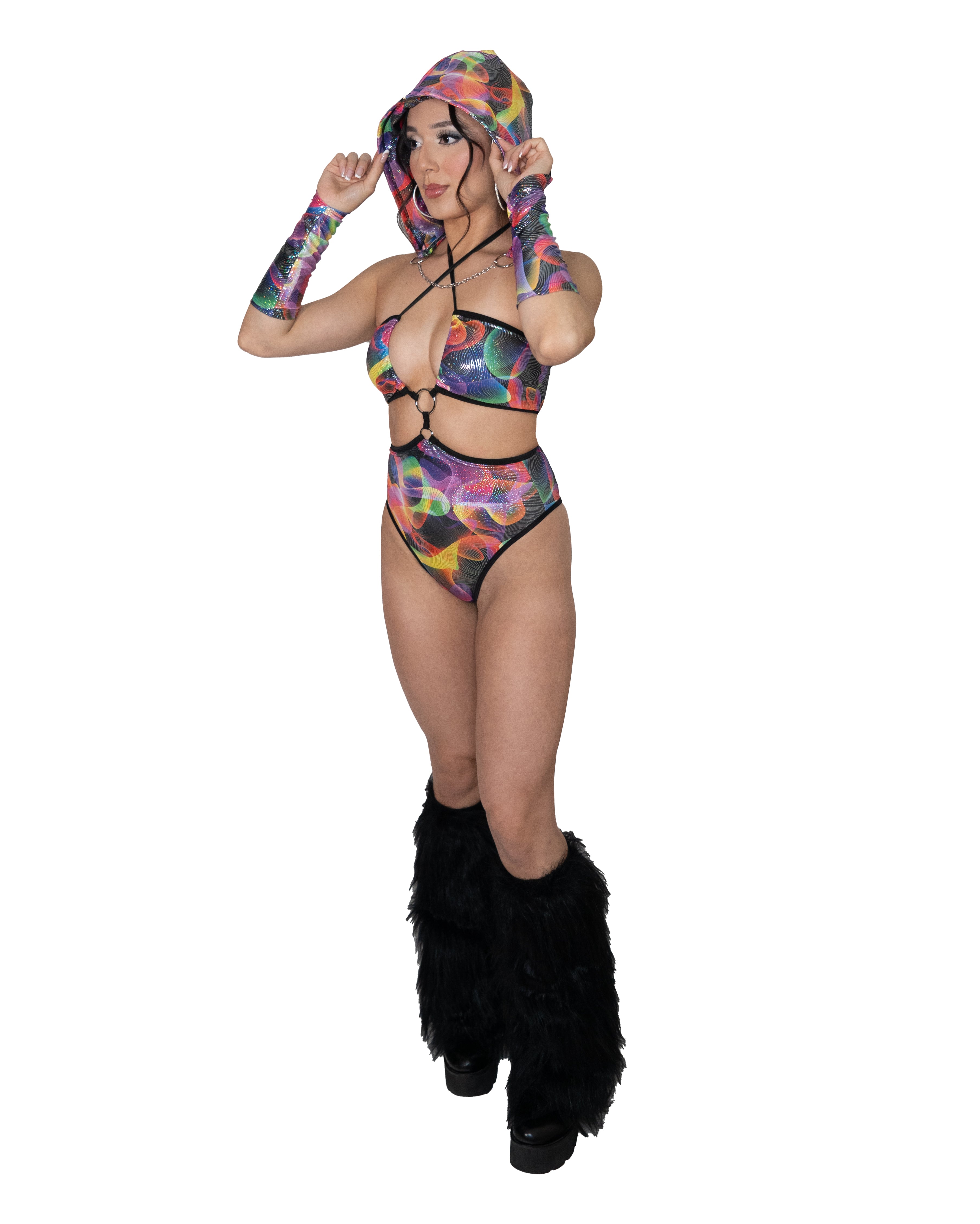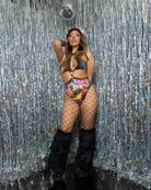 Turn heads in the Retra Boo Bodysuit, a dazzling holographic piece designed for festival-ready flair. Featuring the bold and colorful Retra print, this high-cut bodysuit stuns with O-ring details and a haltered bandeau style top/bodysuit.