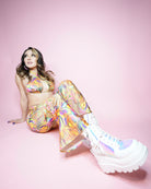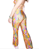 Have the grooviest night in our Groovy Boo Pants. This groovy/trippy fabric is stretchy and hugs your legs in all the right ways featuring a high-rise cut and flared bottoms.
