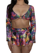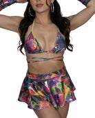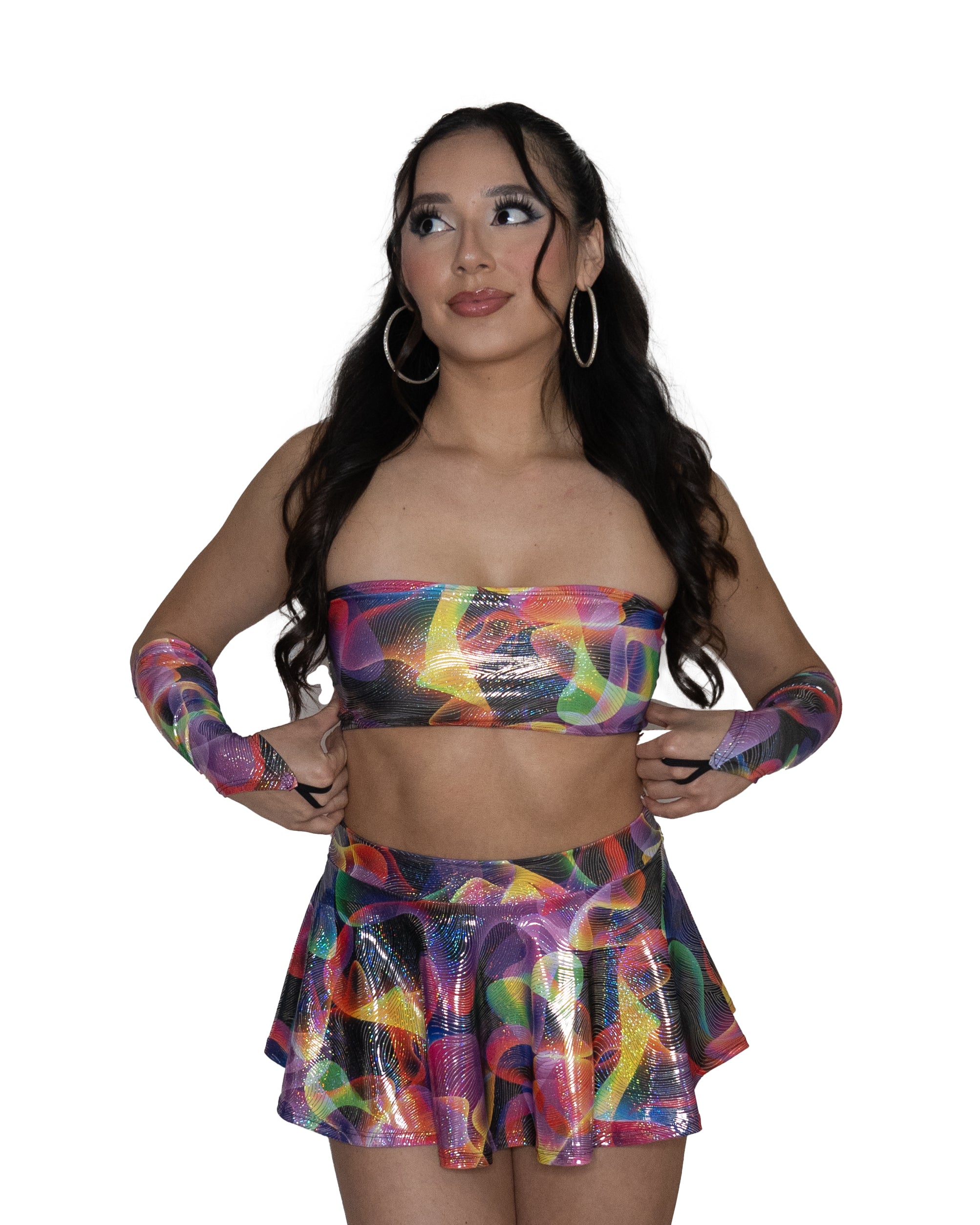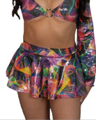Twirl into the spotlight with the Prisma Boo Flowy Mini Skirt, the perfect blend of flirty and baddie festival vibes. Made from the dazzling Prisma print fabric, this holographic mini skirt catches the light with every move. Its flowy silhouette adds a playful touch, making it perfect for dancing at raves, festivals, or any event where you want to shine. Pair it with the matching Prisma Boo pieces for a complete statement look!
