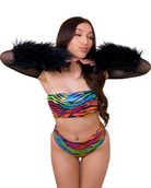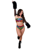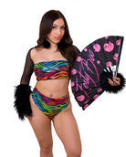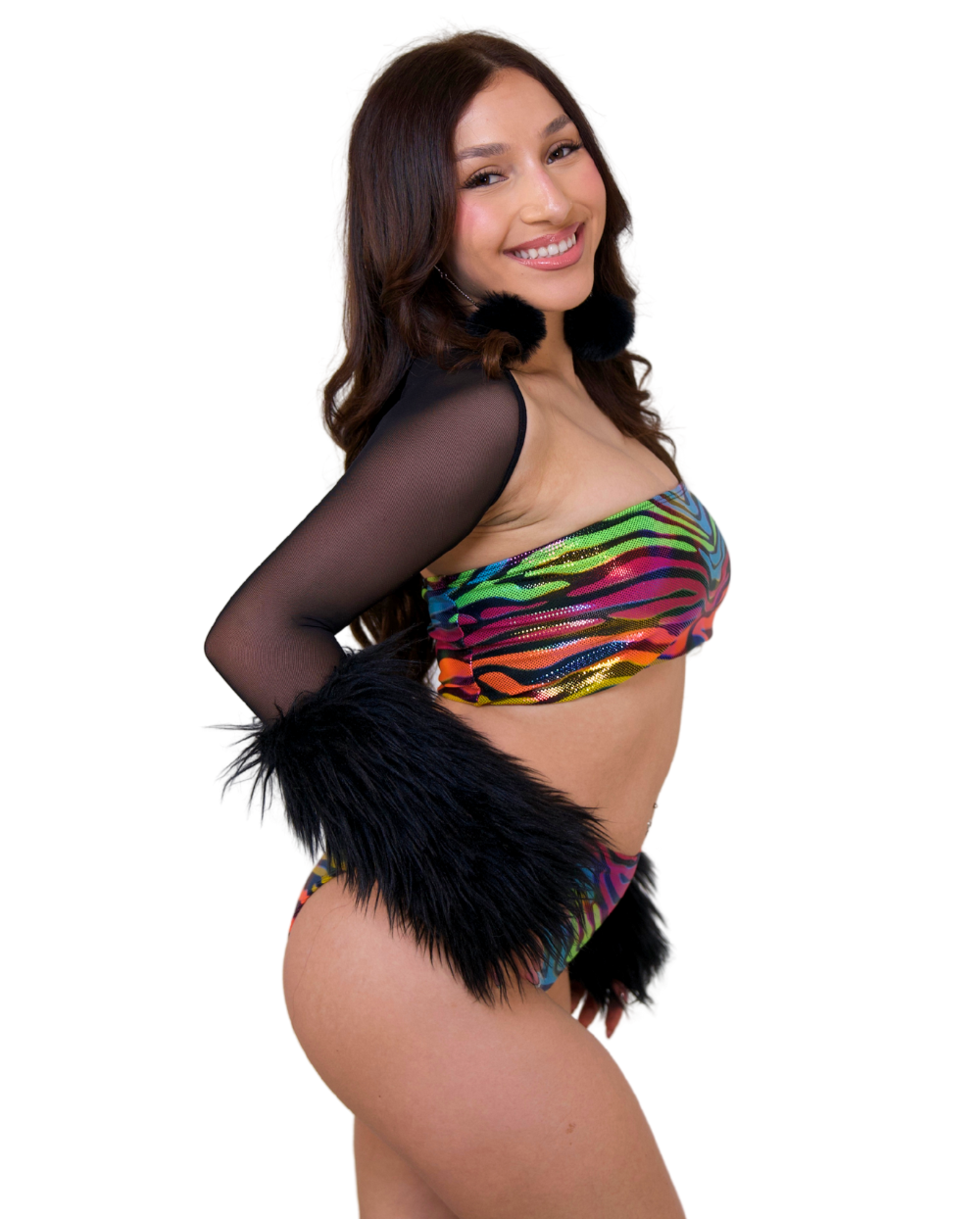 High-rise, holographic, and wildly cheeky. These metallic rainbow tiger bottoms are made to hug your curves and stand out under the lights. Match it with the Untamed Vice Boo Bandeau Top and Black Fur Mesh Shrug for the full look.