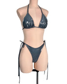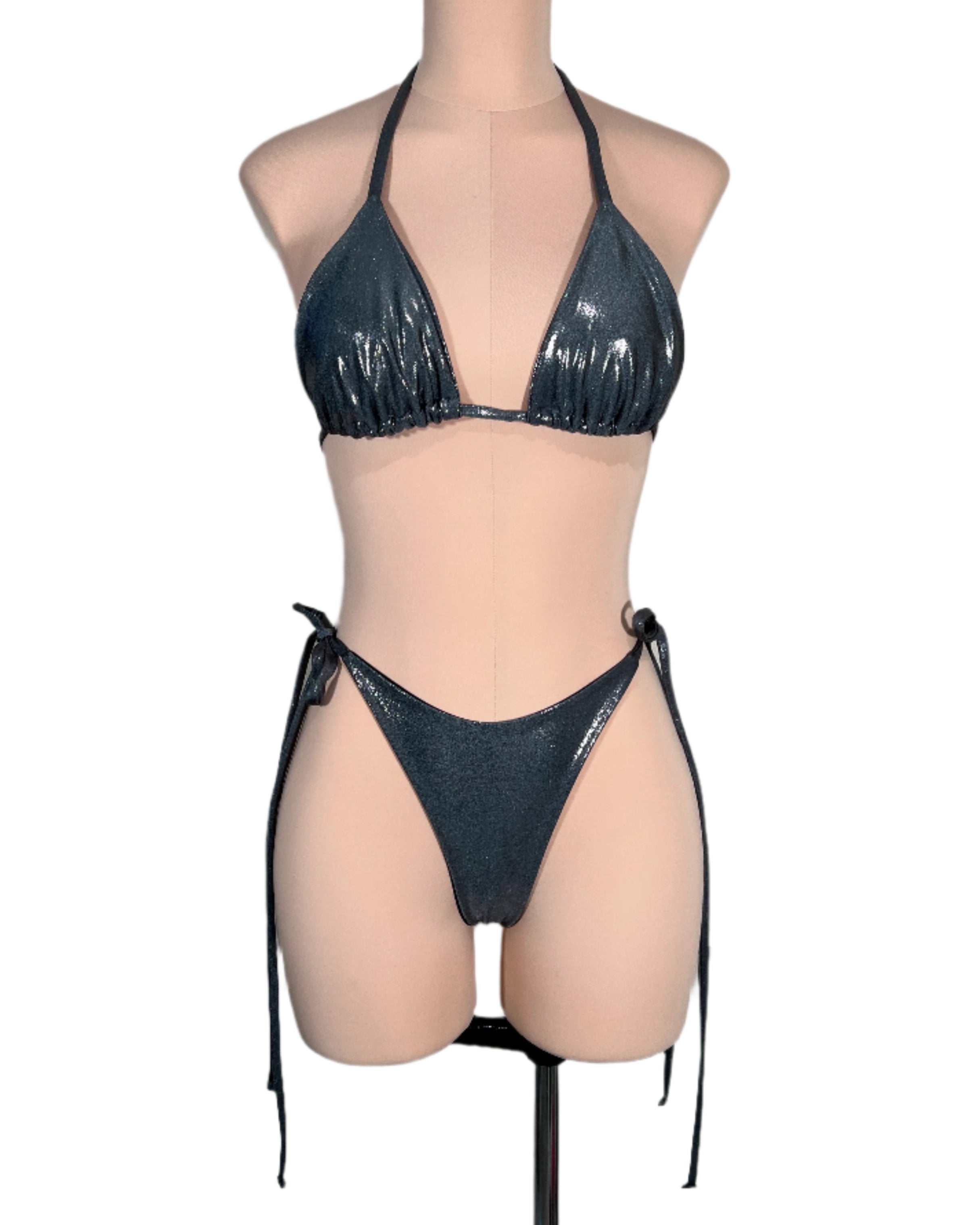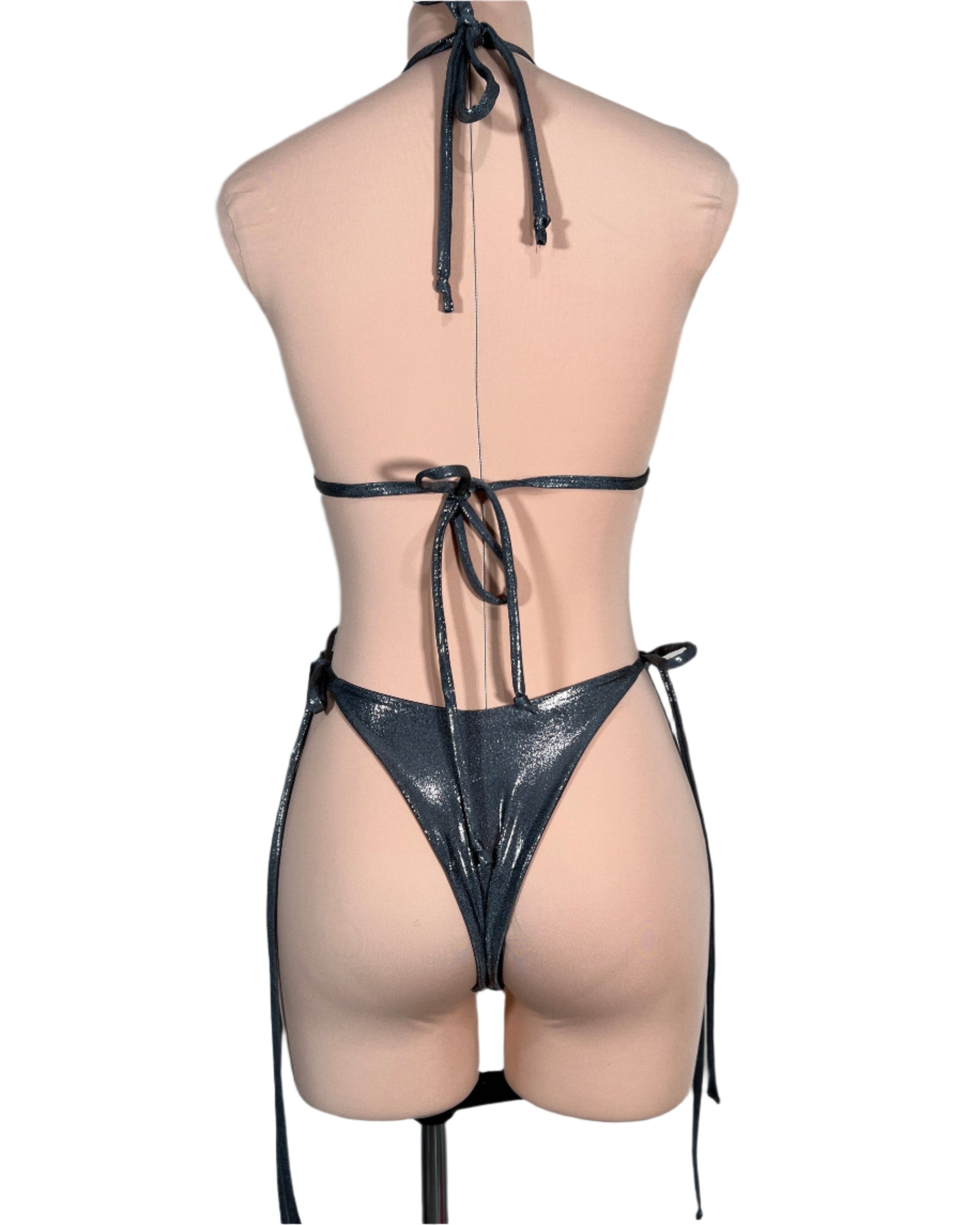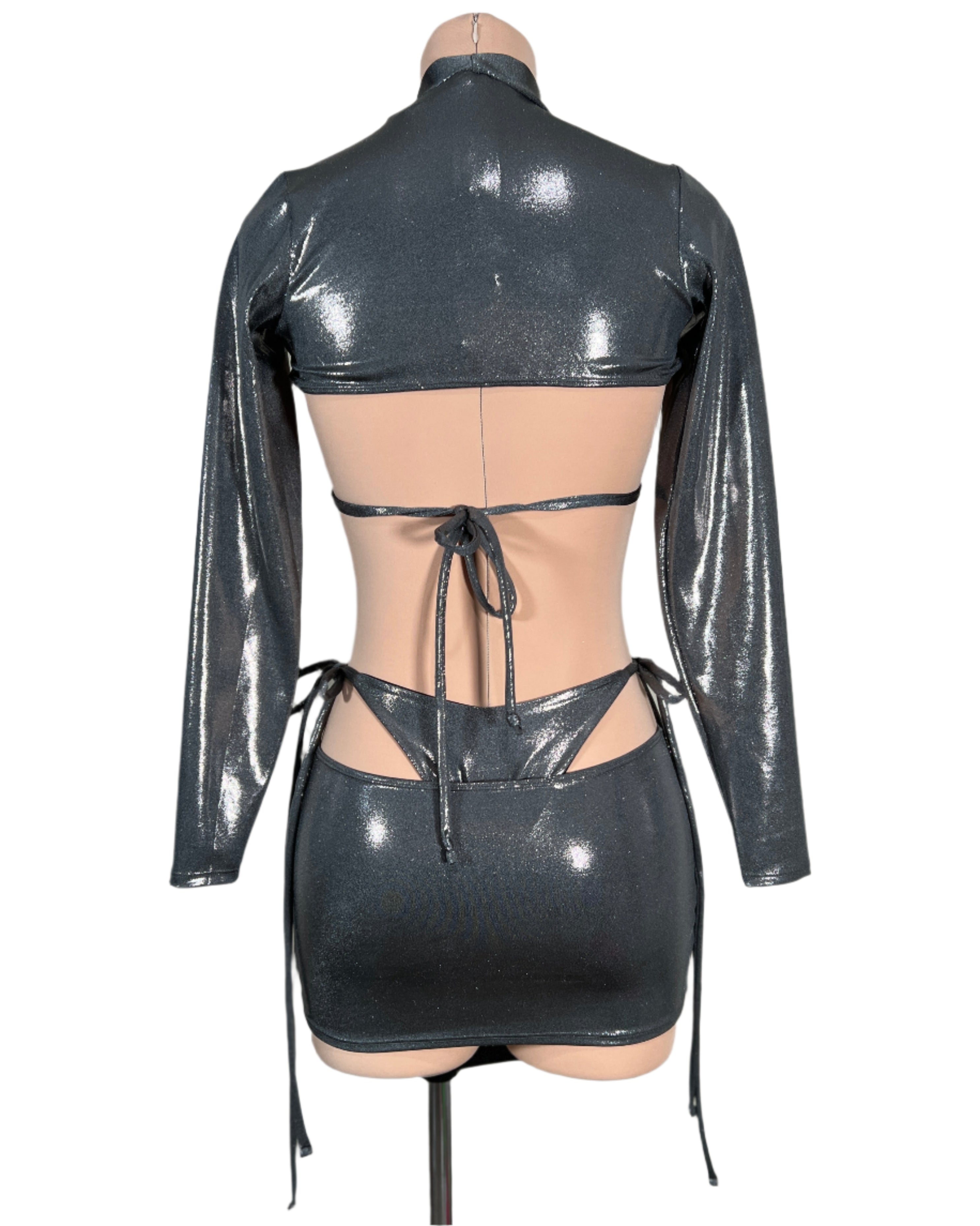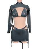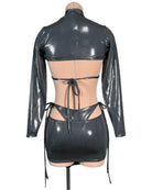 Serve futuristic seduction in this one-of-a-kind charcoal metallic set. Features a glossy triangle bikini top with a matching long-sleeve mock-neck shrug, paired with a sleek high-cut mini skirt with adjustable side ties. The shimmer finish gives it a liquid metal vibe that’s perfect for the dance floor or after-dark festival fits. Only one made in size medium—will not be restocked.