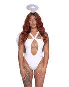 The Angel Boo Bodysuit Set is an ethereal blend of elegance and edge, crafted from white fabric with a sheer, shiny finish for a heavenly look. The bodysuit features a daring cut-out in the center to showcase cleavage.
