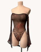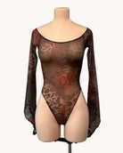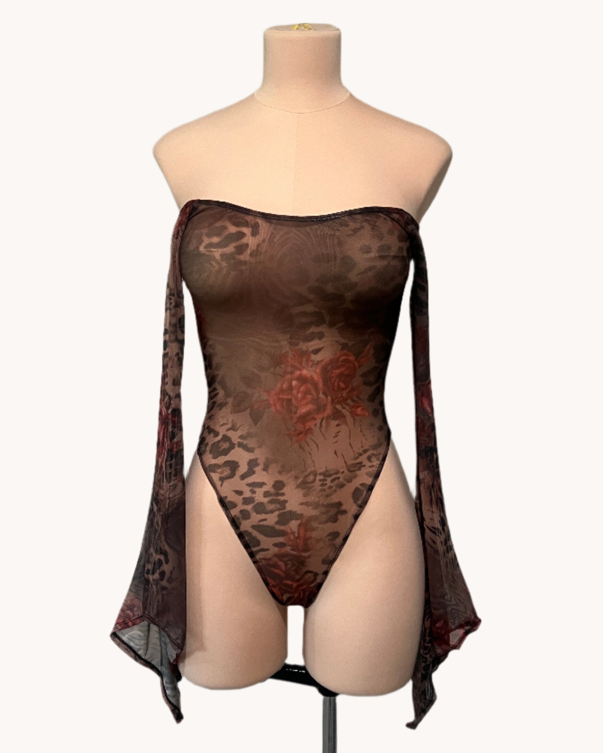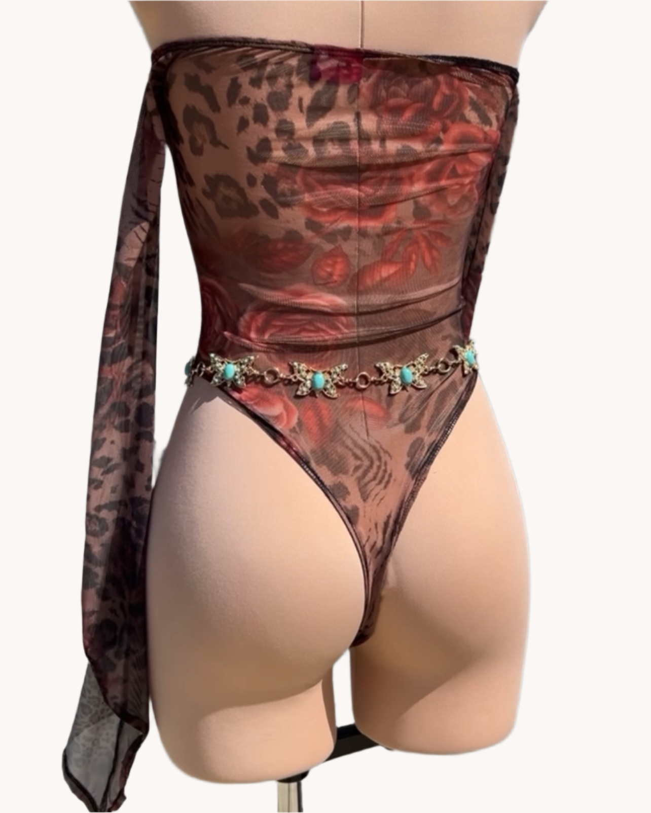 Unleash your wild side in the Sahara Boo – a sheer mesh bodysuit that blends fierce and feminine energy. Featuring a romantic rose and leopard print mix, this strapless piece is designed to contour the body with a soft, breathable stretch mesh. Dramatic mesh sleeves flow from the arms, adding an ethereal, desert-goddess vibe with every move.