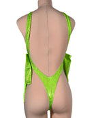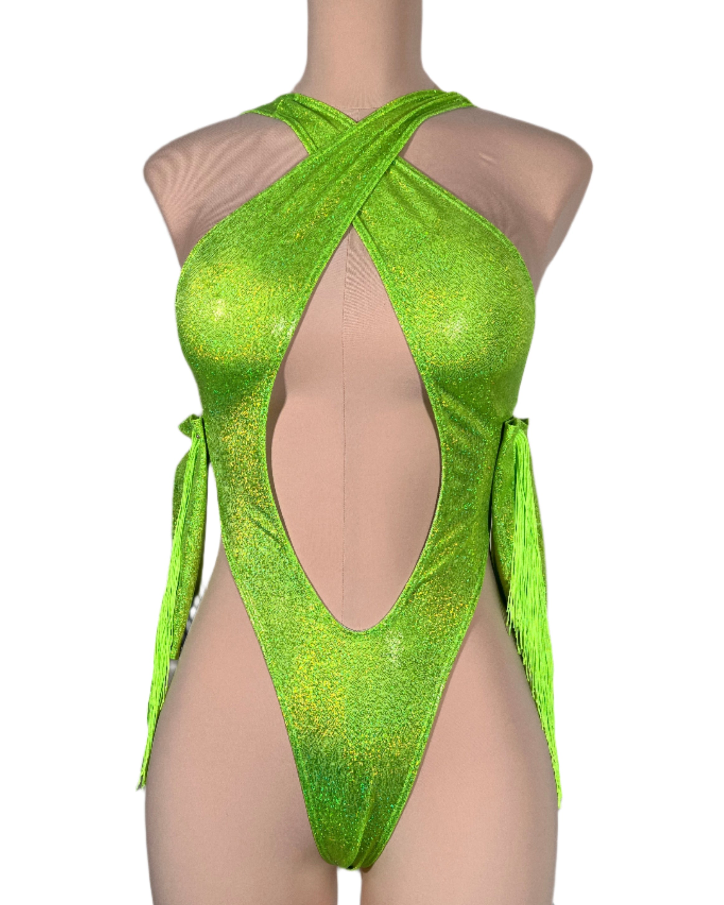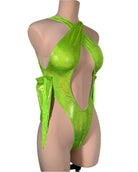 Electrify your day in our Celosia Lime Boo Bodysuit. This outfit shines with a vibrant neon lime green hue that's perfect both poolside and under the neon lights. The bold cut-out design flatters your curves, providing a daring yet comfortable fit that moves with you.