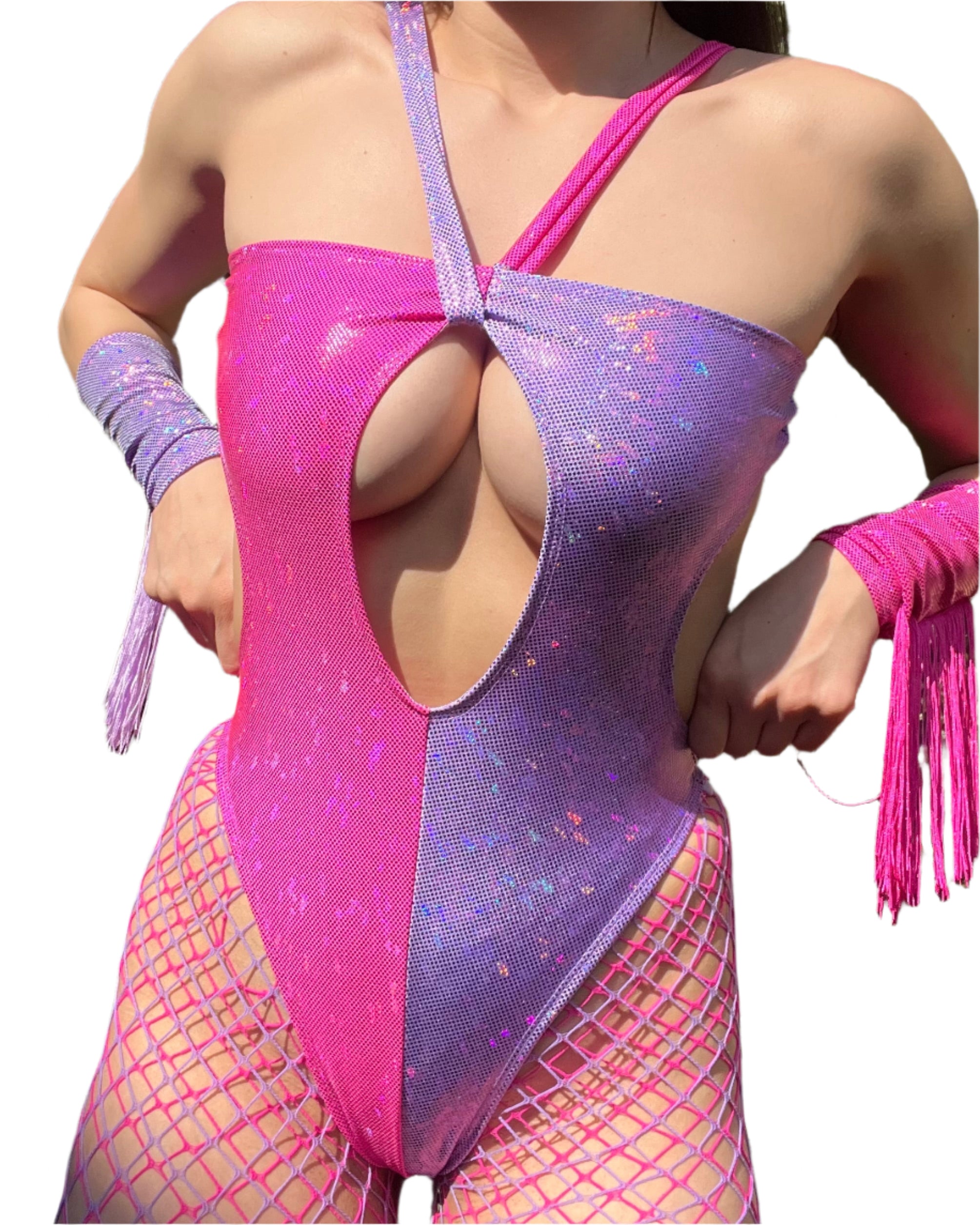 The Cheshire Boo Bodysuit is beyond ur wildest dreams featuring one half in a sparkly purple fabric and the other half in a sparkly hot pink fabric.