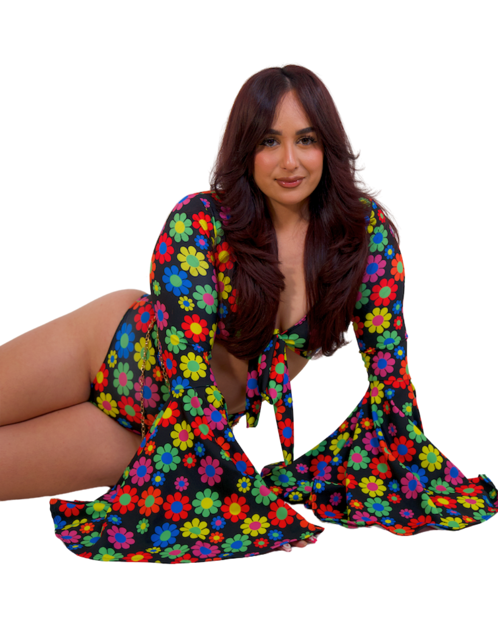 Flirty, flowy, and full of flower power. This tie-front top features long flared sleeves and a stretchy retro daisy print that brings instant main character energy. Pair it with the Daisy Darling Boo High Rise bottoms for the complete look.