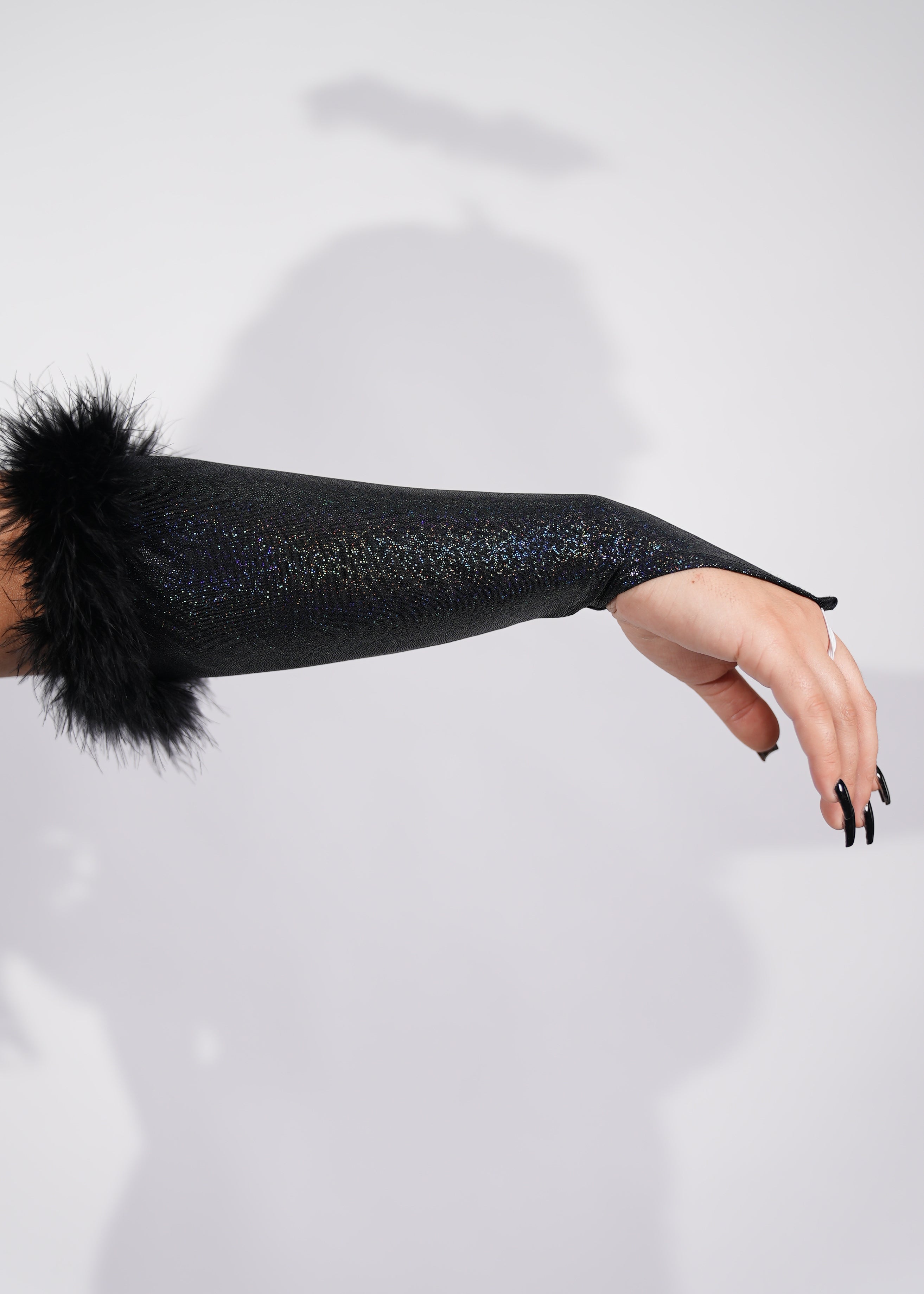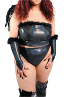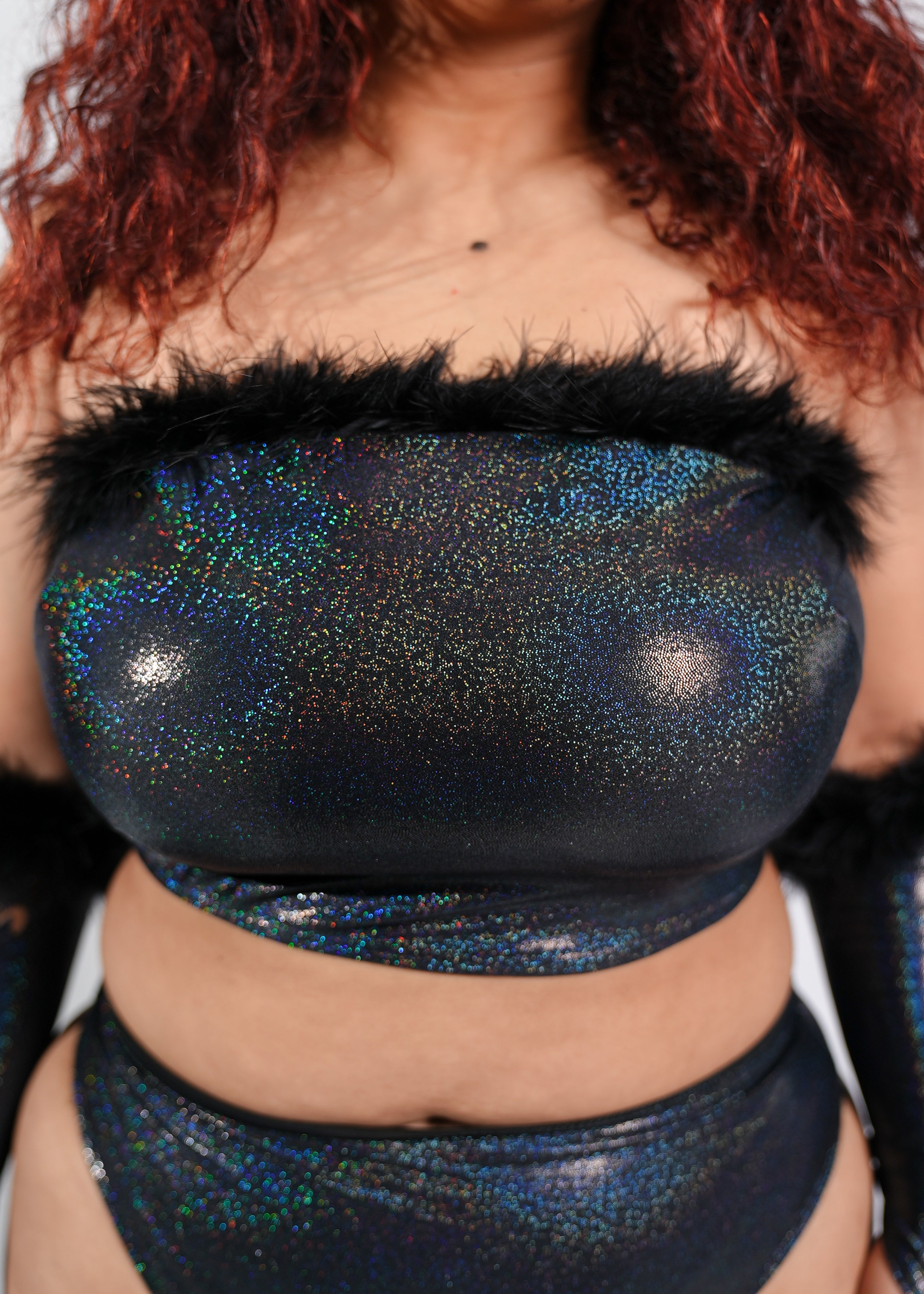 Be ready and set because this three-piece set will transport you to a galaxy far, far away. This set is made for all hot boo's in a black holographic fabric glimmers and shines. The tube top and cuffs are sewn in with a faux black fur and incorporate a cheeky bottom.