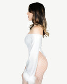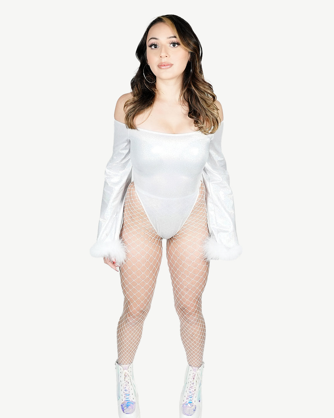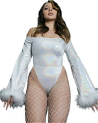 Be the life of the party in our Disco Boo bodysuit. This unique piece features an off-shoulder design with bell sleeves and white fur trim that provides both style, warmth, and cheeky coverage.