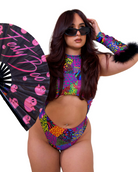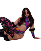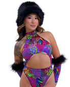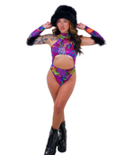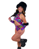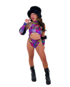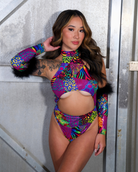 Unleash your inner Y2K wildcat. Feral Lisa Boo is a multicolor animal print bodysuit with a bold cutout front, mock neckline, and high hip thong style fit that screams main character. Complete with the Feral Lisa Boo fur sleeves for the complete look. It's giving rave panther in Lisa Frank’s universe.