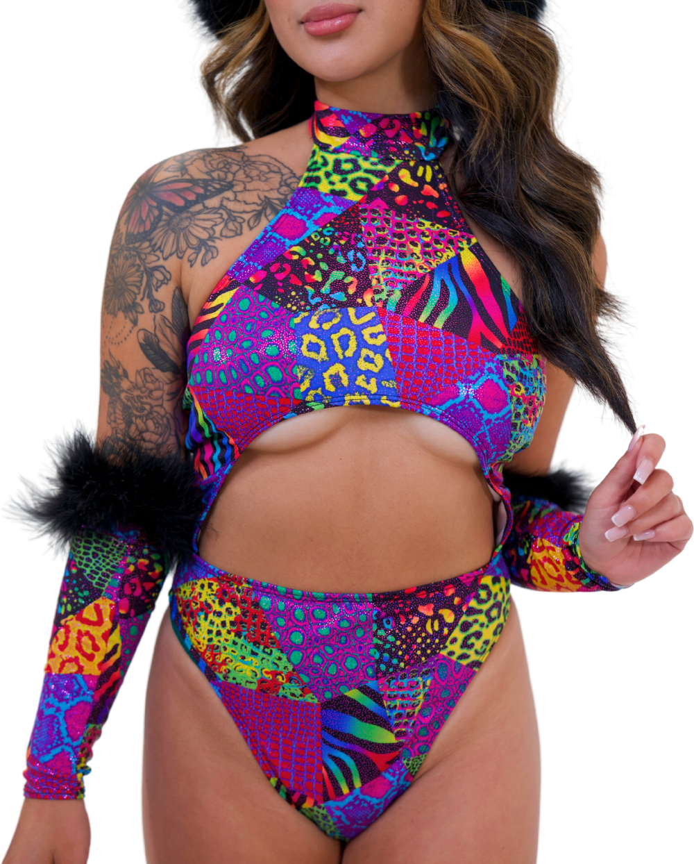 Max out the drama. The Feral Lisa Sleeves are made from the same neon animal patchwork print with fluffy faux fur cuffs that scream glam baddie. Stretchy, bold, and made to steal the spotlight—wear them with the matching Feral Lisa Boo Bodysuit or mix them into any look for an instant upgrade.