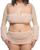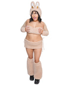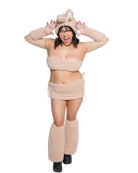 6pc fuzzy monster tan costume set features a soft sherpa bandeau top, matching cheeky bottoms, long sleeve shrug, lace up mini skirt, plush leg warmers, and adjustable ear headband. Made with ultra-soft fabric for maximum comfort perfect for Halloween parties, raves, or cosplay nights.