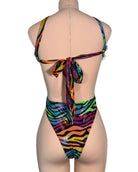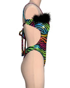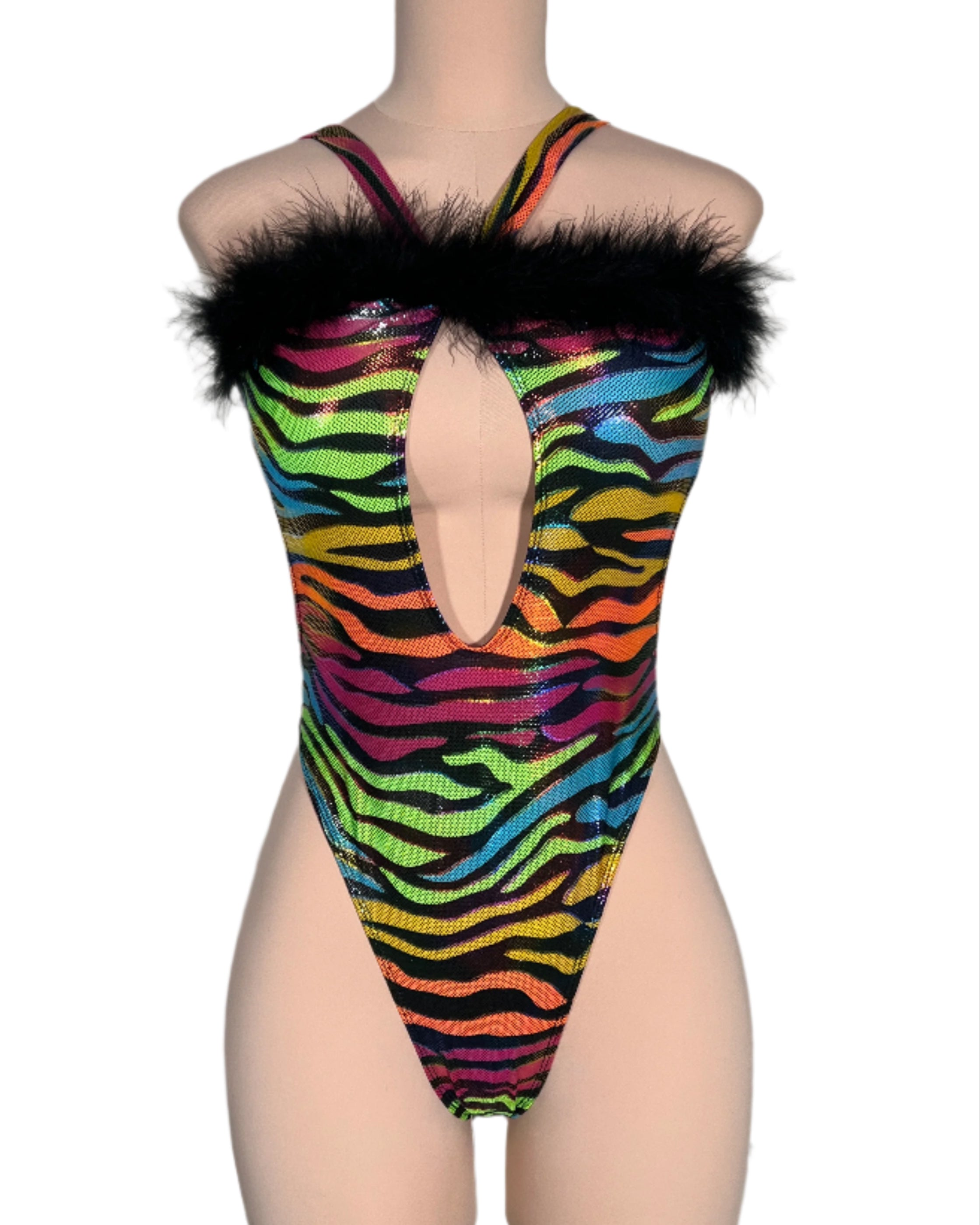 When cute isn’t enough—you go untamed. This high-cut bodysuit is made in our signature rainbow tiger stripe fabric with a dramatic keyhole cutout and bold faux fur trim right above the cleavage for extra drama. Stretchy, shiny, and dangerously hot. Add the matching Untamed Vice Boo sleeves if you’re feeling extra feral.