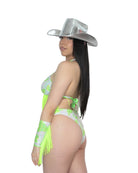 The Space Cowgirl Boo Set fuses futuristic vibes with classic cowgirl style, featuring green and white cow print fabric finished with a sparkly silver overlay. The top is trimmed with green fringe for a playful touch, paired with mid-rise cheeky bottoms and matching cuffs with fringe accents, creating an out-of-this-world look perfect for festivals or Halloween.