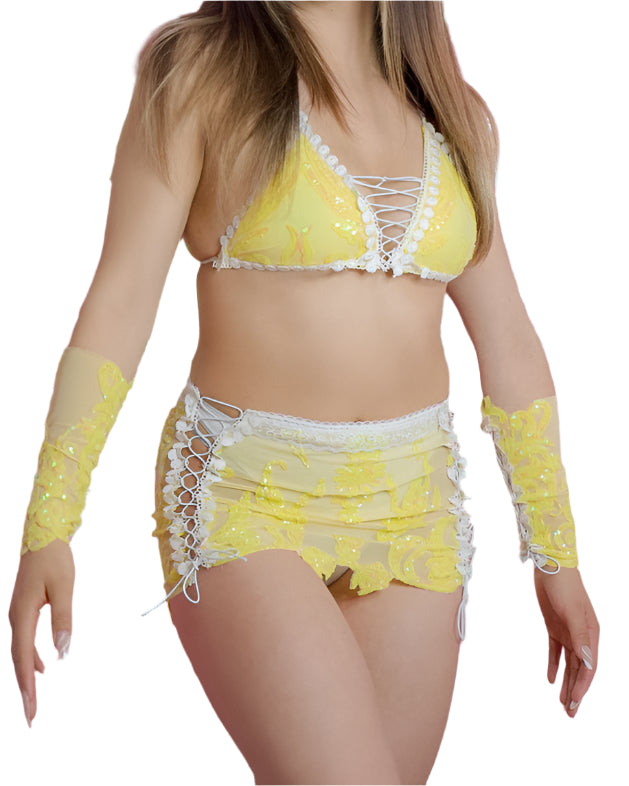 This is a boo summer, bloom out in our Summer Boo outfit. Our skirt and top features an iridescent yellow fabric and is trimmed with lace. Cuffs are sold separately.