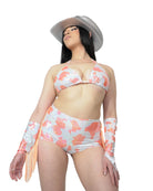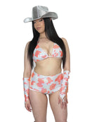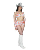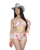 Embrace your wild side with our dazzling orange cowgirl outfit, featuring cheeky mini shorts adorned with playful fringe, a flattering triangle top, and stylish arm cuffs that sway with every move.