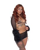 The Tiger Temptress Boo Set unleashes bold safari vibes with its striking tiger-print fabric and sultry design. This set features side-tie thong bottoms, a matching triangle top, and a black mesh skirt with tiger-print binding at the waist. The look is completed with a long-sleeve shrug made from black fabric, accented with tiger-print binding and finished with soft fur at the cuffs for a fierce and luxe touch. Perfect for festivals, parties, or Halloween, this set is designed to command attention.
