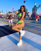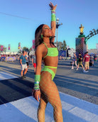 Feel like Tinker in this sparkly green fabric and spread your pixie dust! Set includes top, mid-rise bottoms, and cuffs.