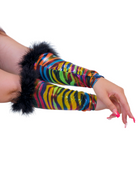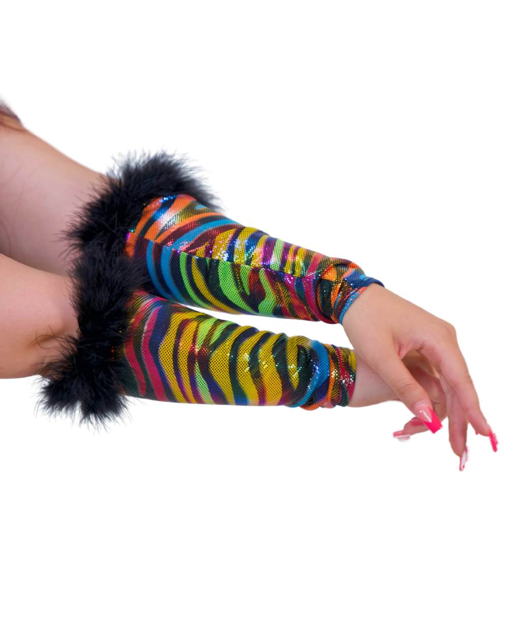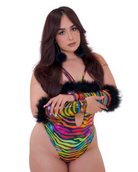When cute isn’t enough—you go untamed. This high-cut bodysuit is made in our signature rainbow tiger stripe fabric with a dramatic keyhole cutout and bold faux fur trim right above the cleavage for extra drama. Stretchy, shiny, and dangerously hot. Add the matching Untamed Vice Boo sleeves if you’re feeling extra feral.