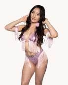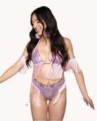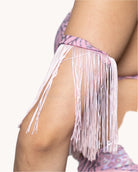 Complete the look with these flirty fringe sleeves made from matching pink sequin animal print fabric. Designed to elevate any rave or festival fit, these stretchy sleeves hug your arms comfortably while the soft fringe sways with every move. Whether worn solo or with the full Wildly Pink Boo set, they bring drama, dimension, and dancefloor energy.