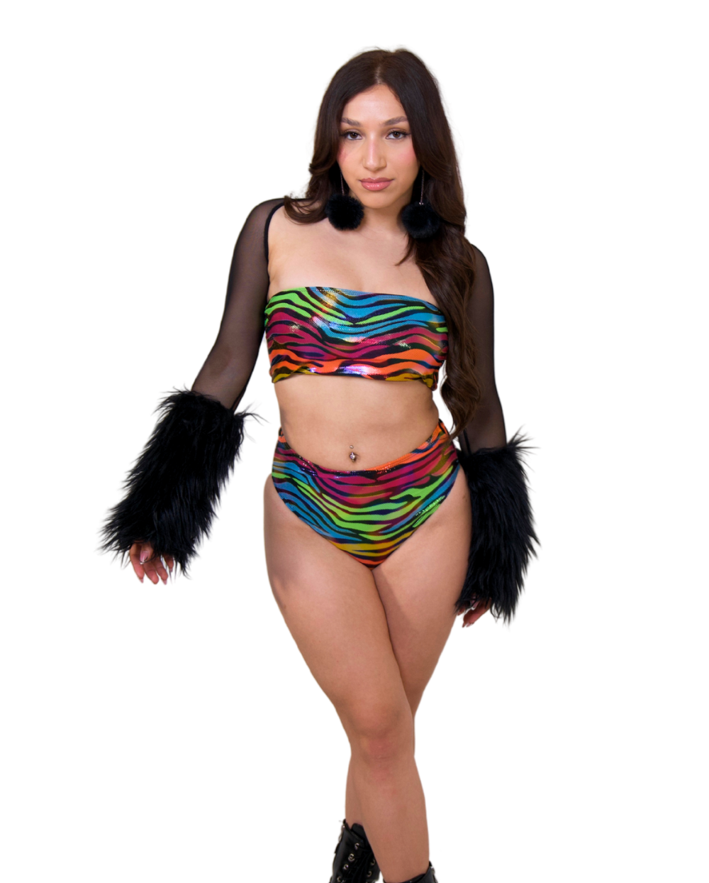 Go full glam-zebra in this metallic rainbow bandeau. Made from a stretchy holographic tiger print with a sleek strapless cut that’s perfect for layering or rocking solo. Rave-ready with max attitude. Pair with the matching Untamed Vice Boo High Rise Bottoms and the Black Mesh Fur Shrug for the complete look.