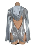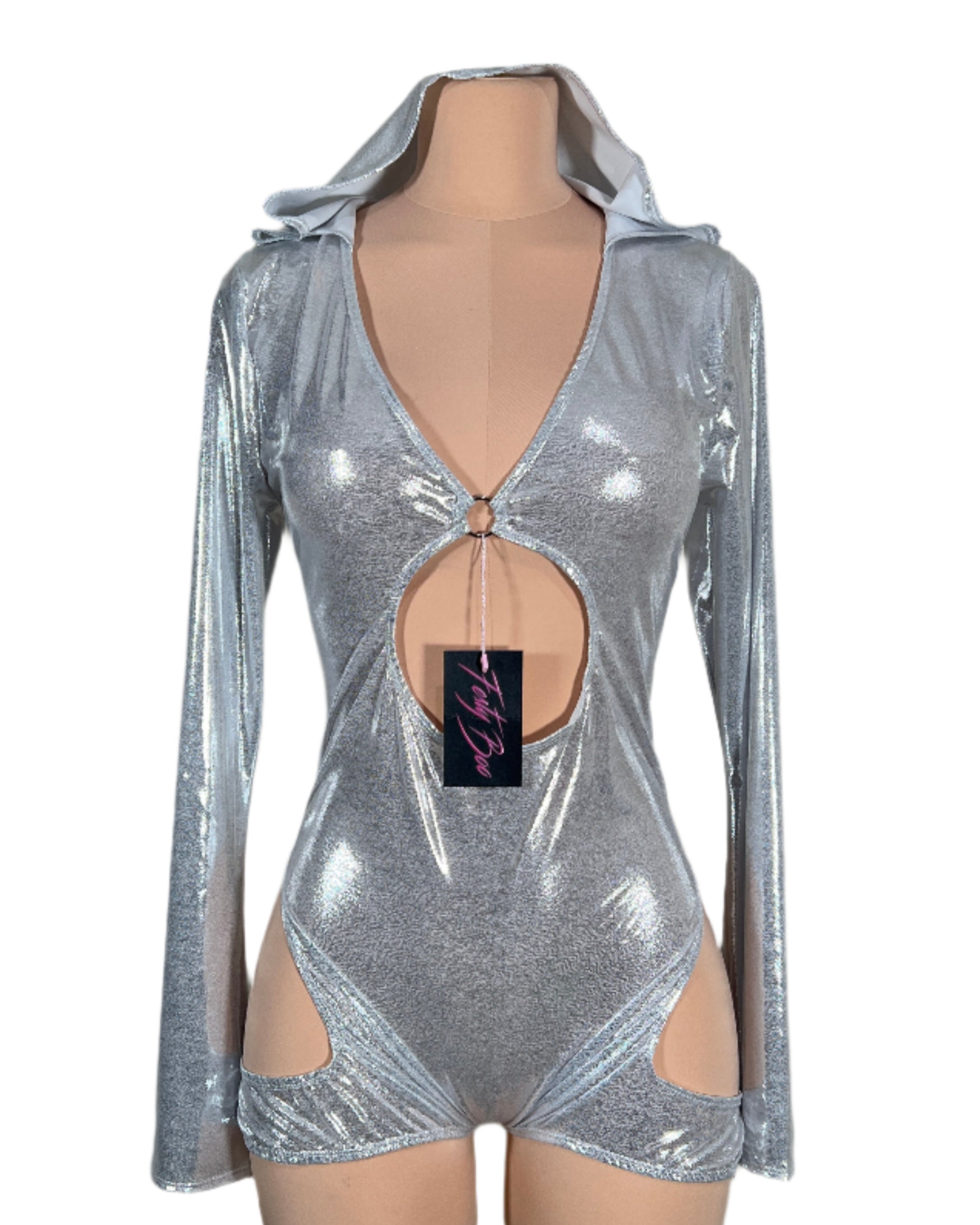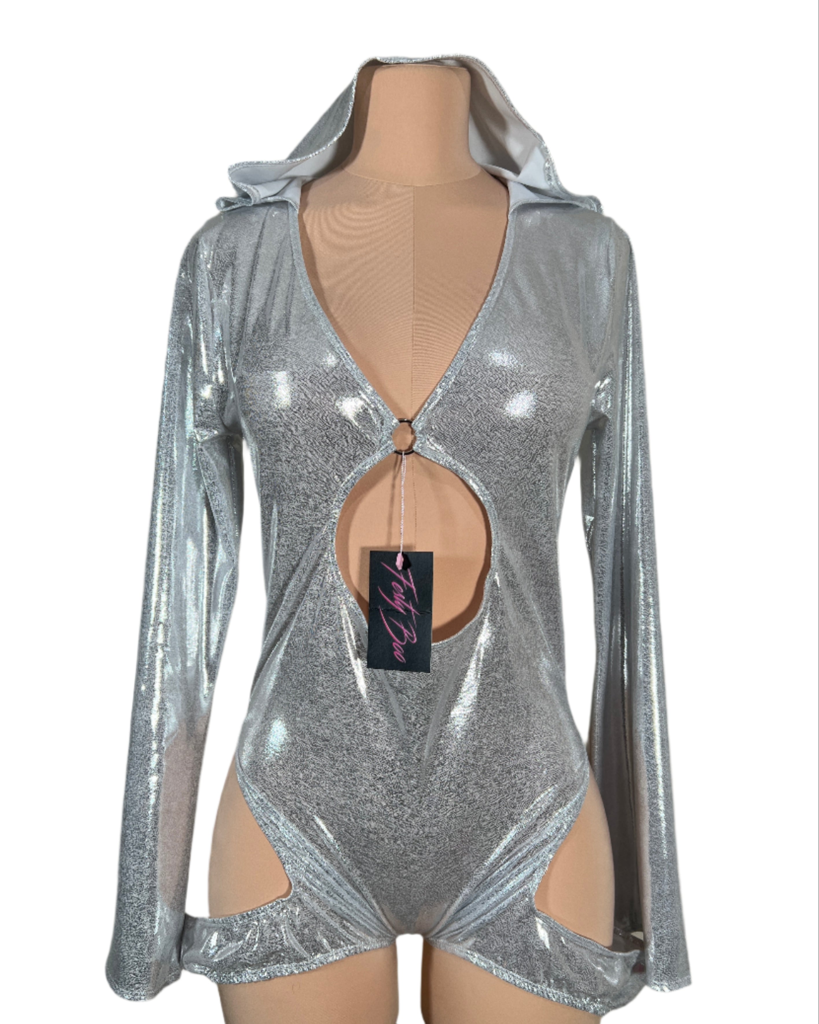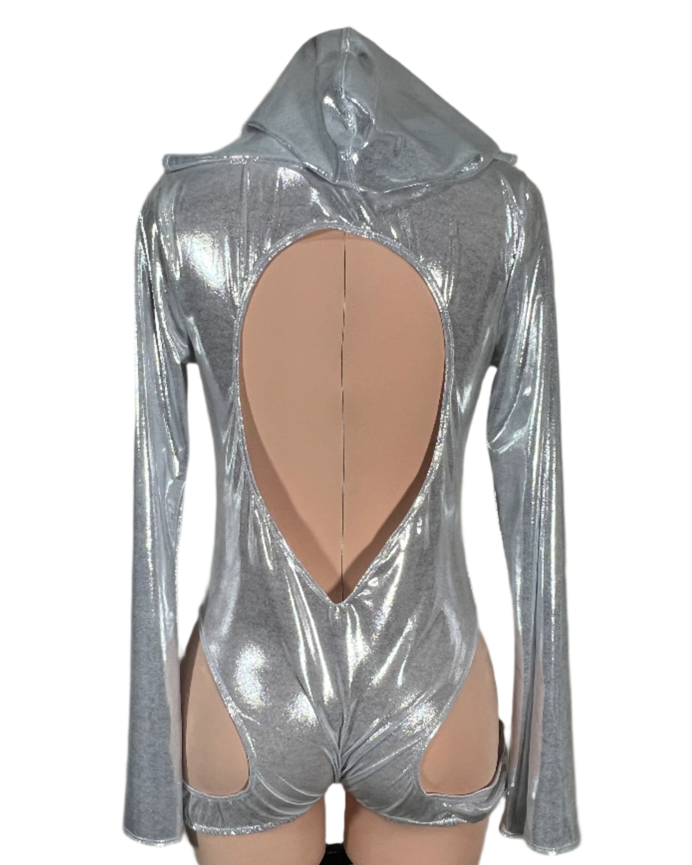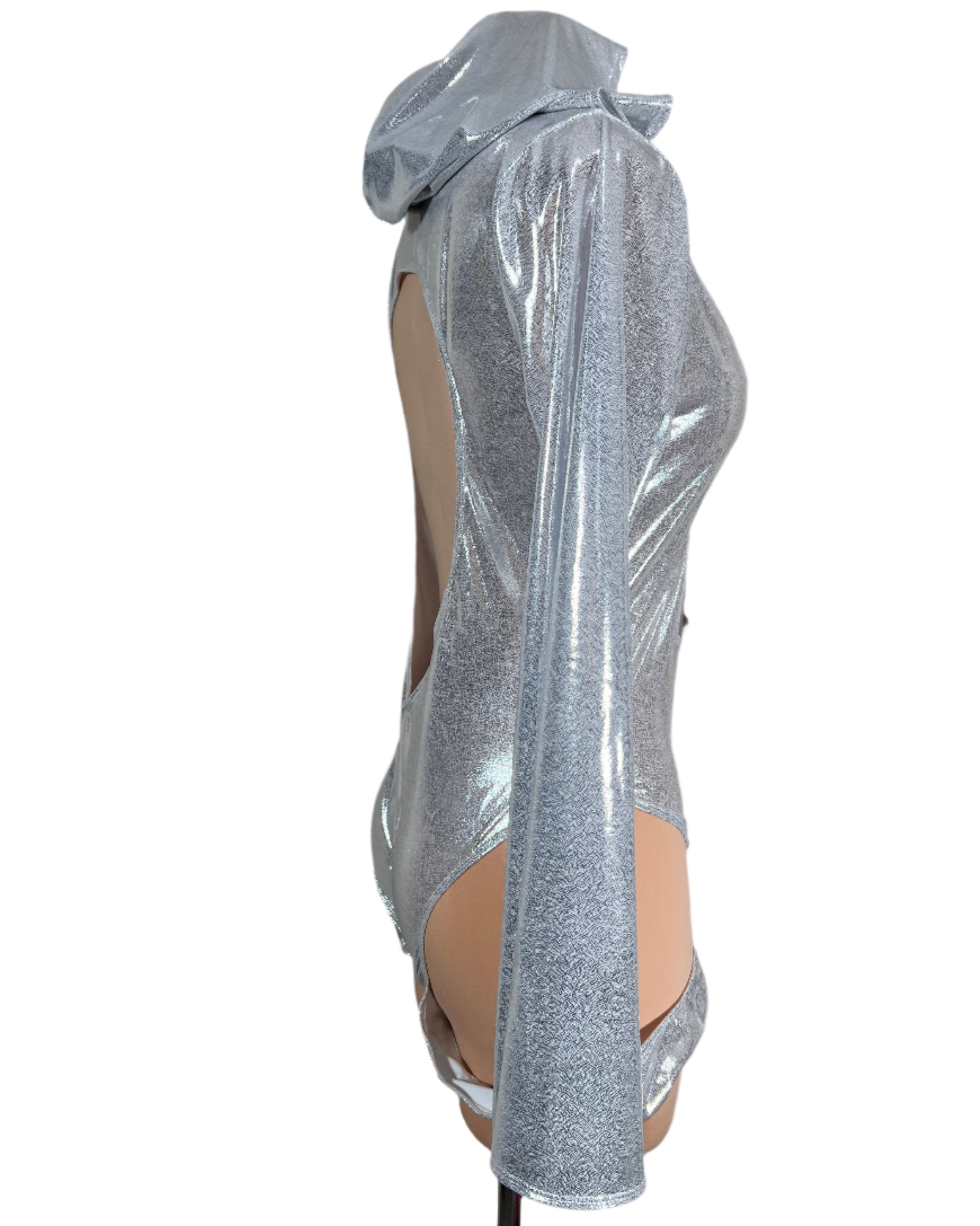 Drip in cosmic energy with this metallic silver hooded bodysuit, featuring a plunging neckline, O-ring cutout front, and bold hip cutouts for a sultry silhouette. Made from glistening stretch fabric that hugs in all the right places. Long sleeves add drama while the hood brings a mysterious edge. Only one made in size 2XL—this style will not be remade. Mannequin has pins to hug the body and show the shape of the outfit however this is a 2XL.