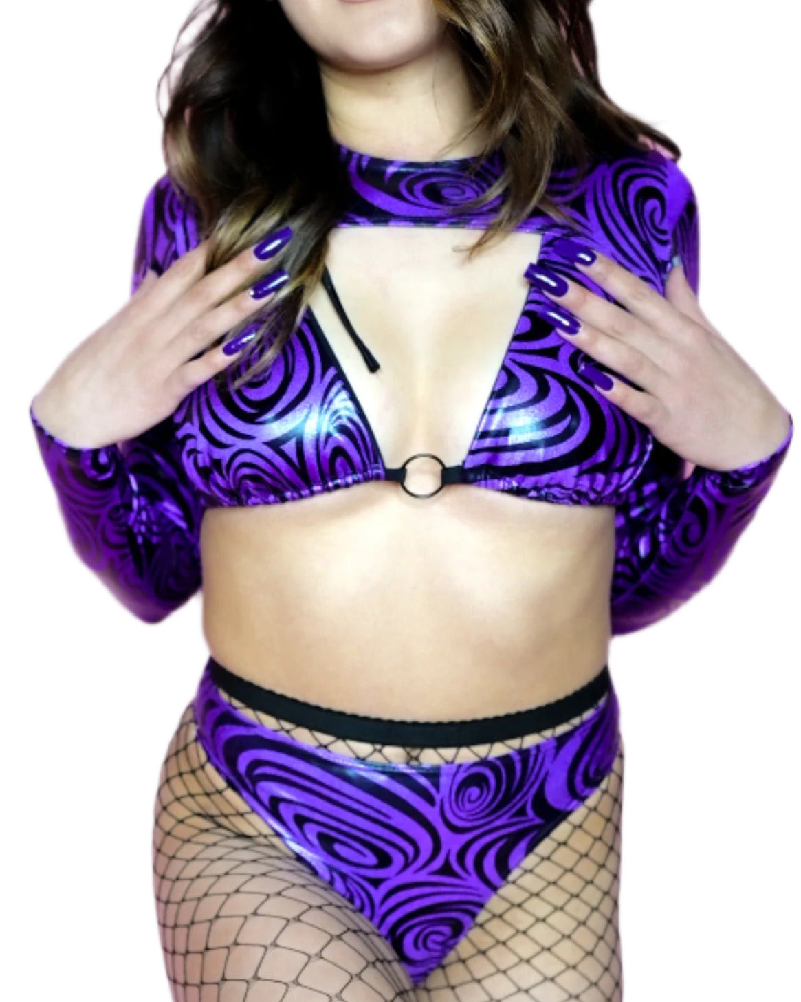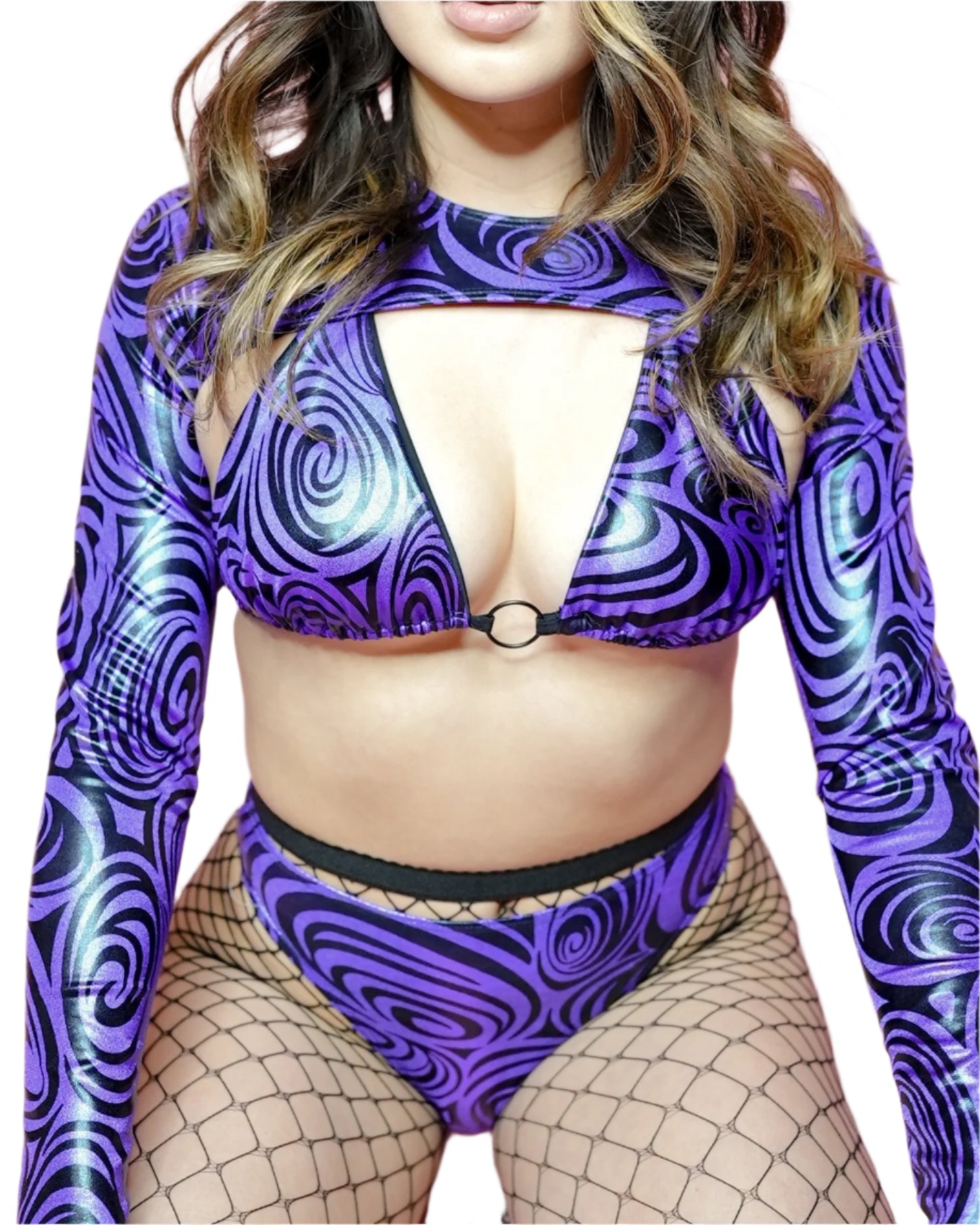 Complete all your purple desires in this Purple Swirl Set. Hugging your body is a long sleeved crop top, triangle top met in the middle with a black O-Ring, and a mid rise bottom.